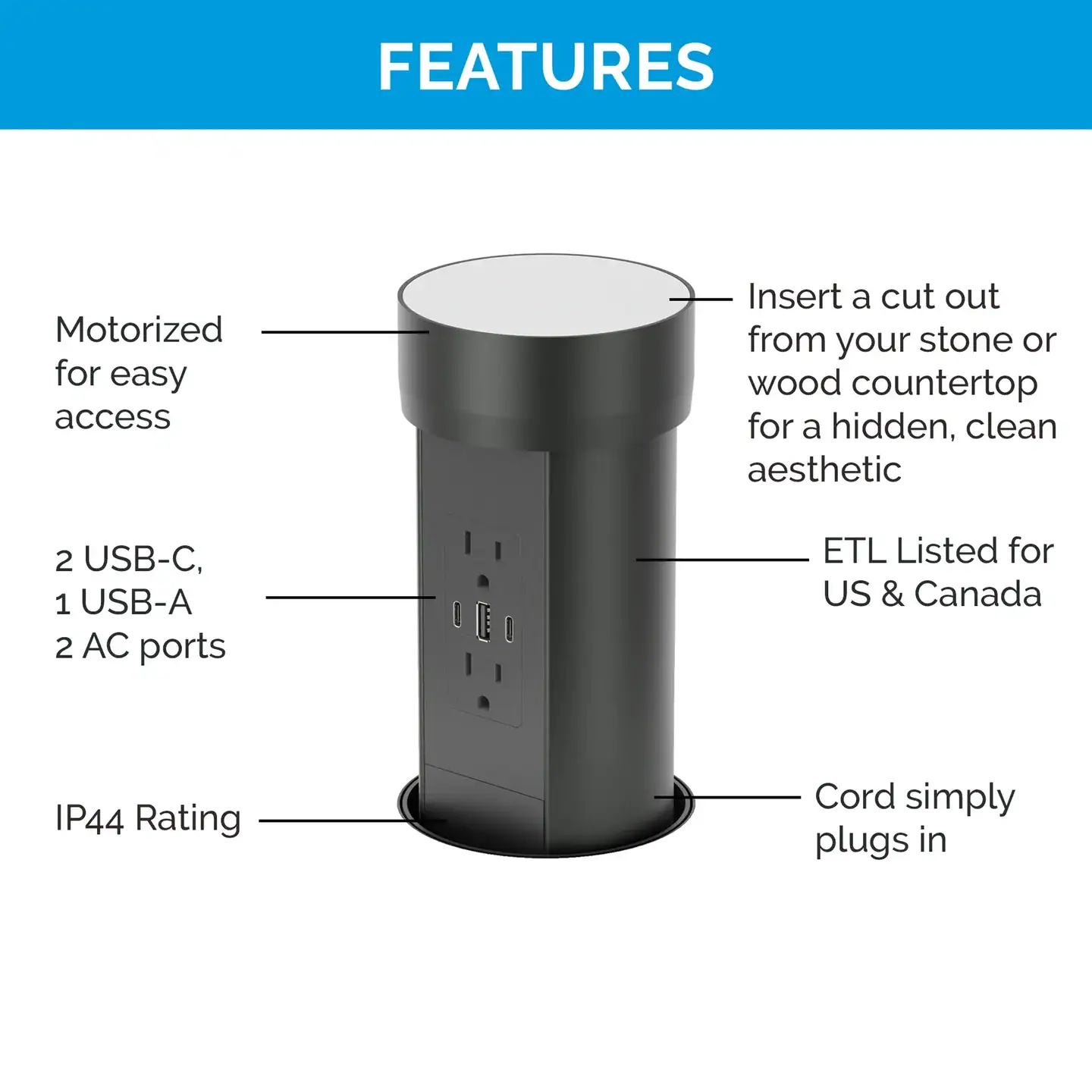 Experience unparalleled convenience with Point Pod Connect’s motorized functionality. With a gentle touch, experience the smooth and quiet rise of the pop-up outlet unit, revealing two power plugs and three USB charging ports at your fingertips. Engineered with both accessibility and safety in mind, this outlet incorporates a sensor that detects obstructions—preventing accidents, prioritizing user safety, and providing peace of mind with every use.