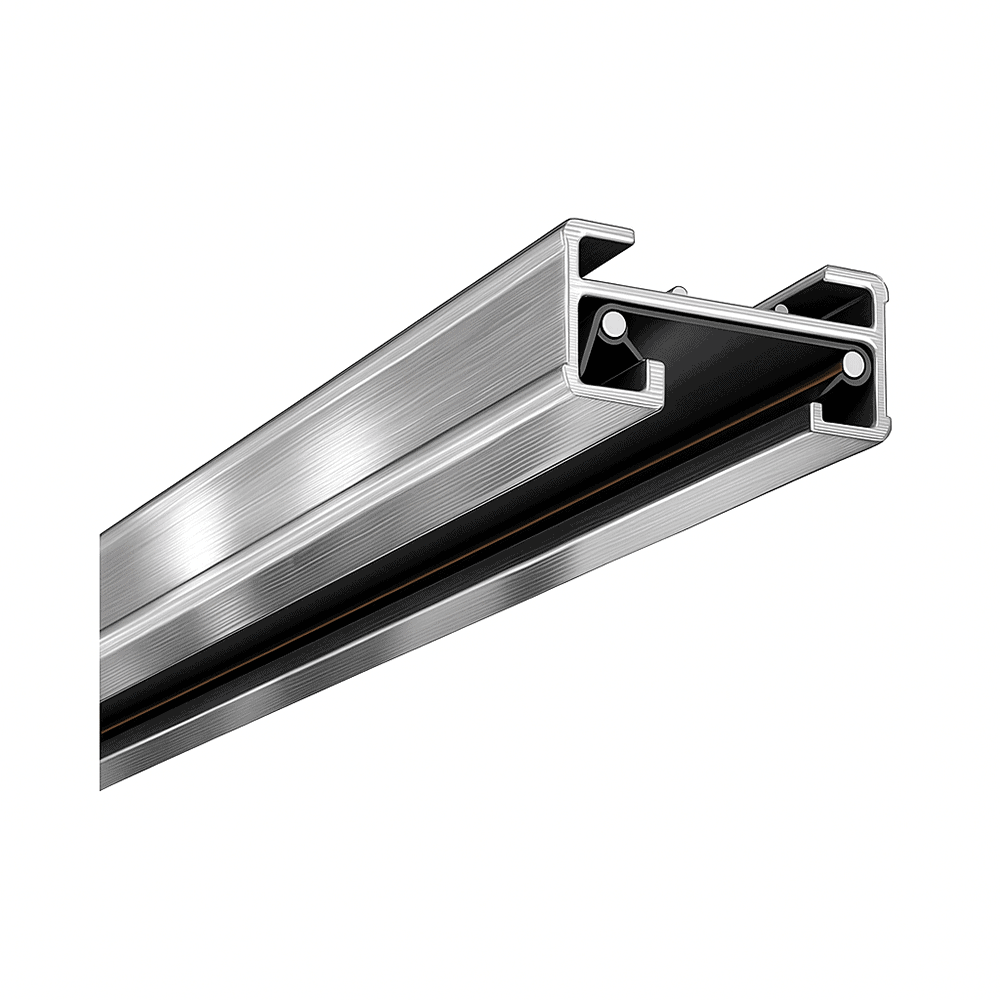 Constructed of 0.06″ extruded aluminum with 0.045″ PVC bus bar support holding 12 gauge round bus bars. Polarity groove is located on face of track to indicate location of grounding conductor.