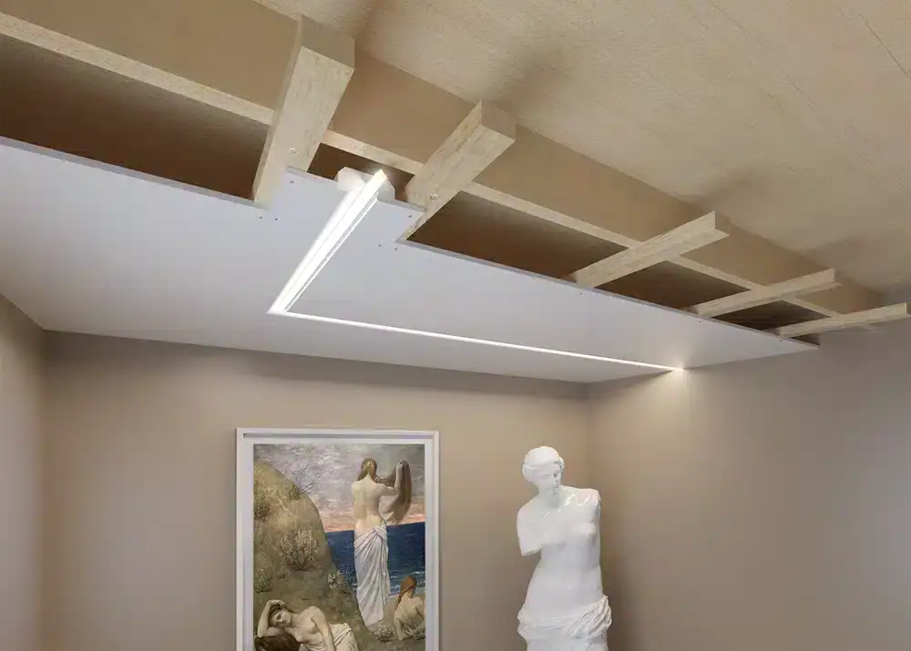 The LATUS is an asymmetric recessed LED moulding for drywall, allowing washing an adjacent surface with light from a 45-degree angle, from a distance of your choice. The uniform light distribution enhances the appearance of art and displayed items. A direct fit with standard gypsum panels, it needs only a low (1-1/4in.) back clearance, and can be easily installed between smaller beams or joists.