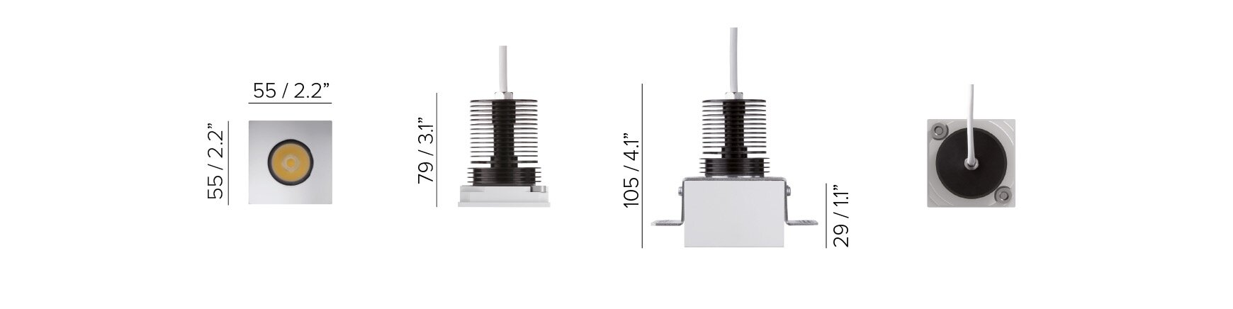 • 24V DC: features an onboard DC driver that ensures overcurrent protection and it is not polarity sensitive. Electronic control of operating temperature through a thermal sensor that detects overheat and, by self-regulating the current, reduces the LED power. This feature guarantees that the luminaire will last in time with ambient temperature up to 140°F