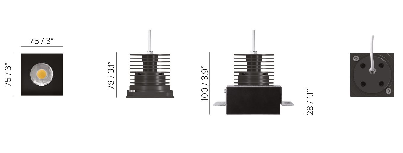 48V DC: features an onboard DC driver that ensures overcurrent protection and it is not polarity sensitive. Electronic control of operating temperature through a thermal sensor that detects overheat and, by self-regulating the current, reduces the LED power. This feature guarantees that the luminaire will last in time with ambient temperature up to 140°F