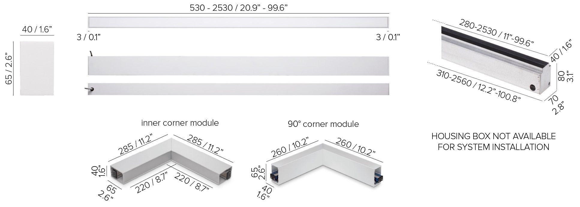 Available in increments of 9.8″ from 11” to 99.6” and upon request available with custom measurements. Available also in the system version (Inserto 65 F System) with corner modules