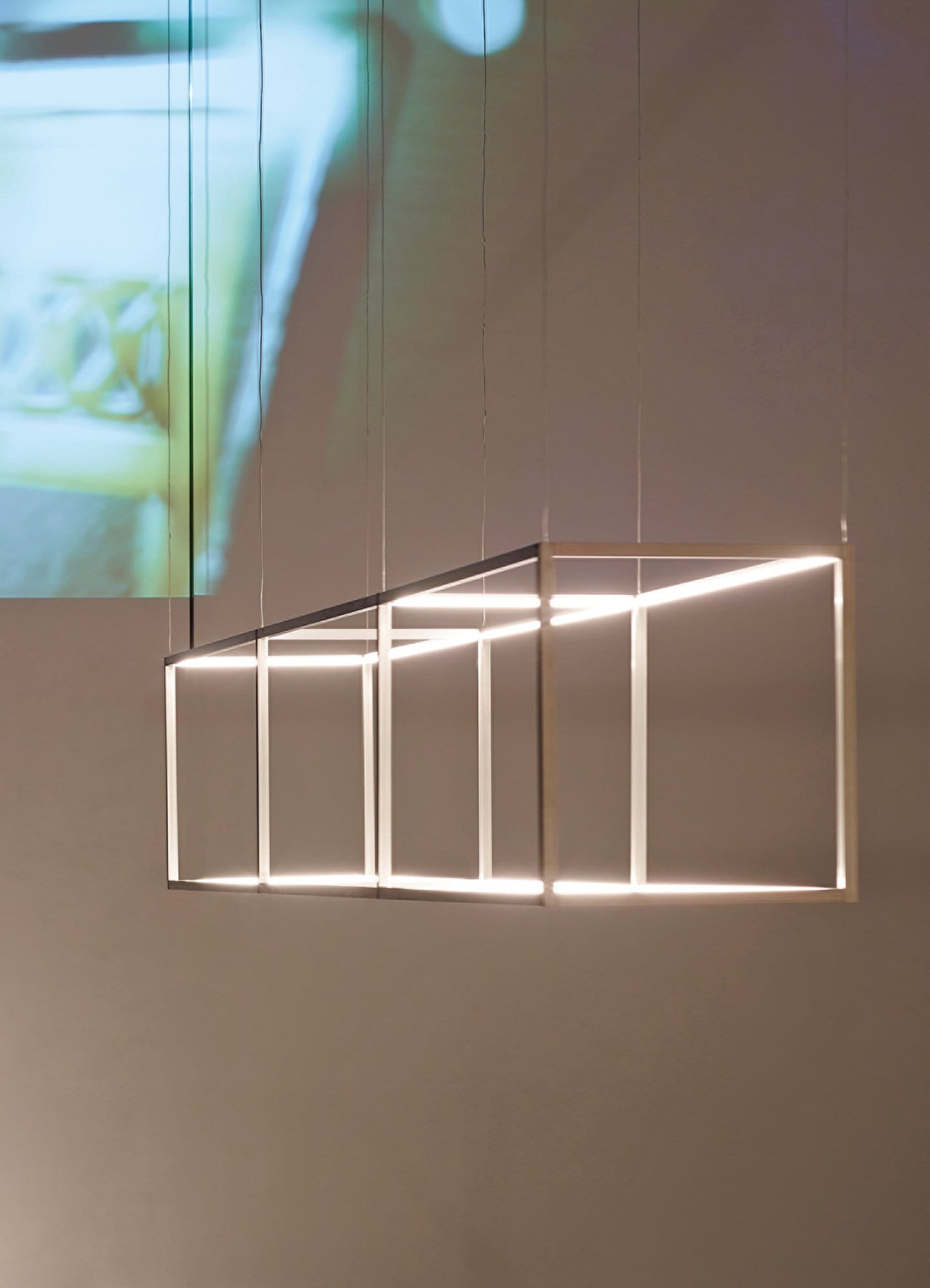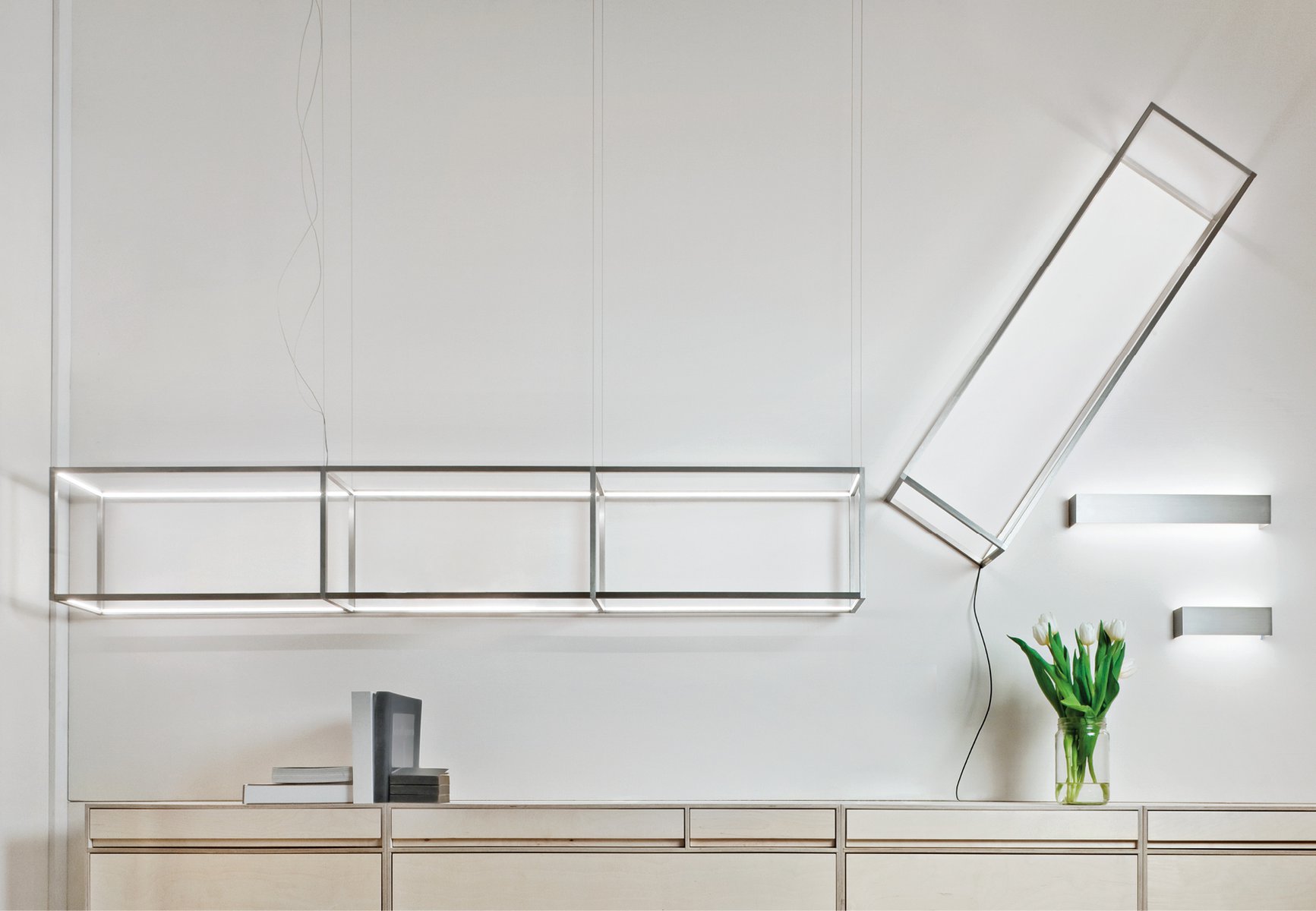 This pendant system is a factory made configuration based on the 13D Angolo extrusion. This system can be a pendant, wall or floor, custom assembled to your sketch!