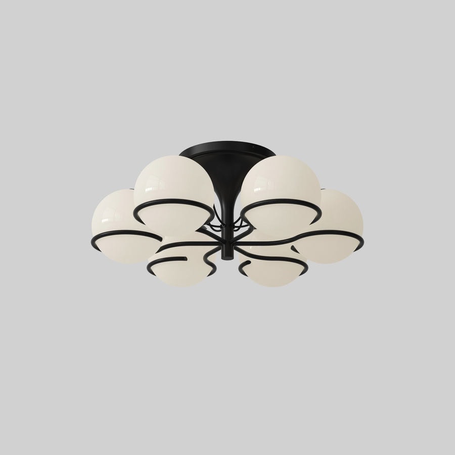 With the Le Sfere Plafone, Model 2042/3 from 1963, Gino Sarfatti has created yet another beautiful interpretation of the luminous sphere. This refined ceiling light is composed of six blown opaline glass spheres, each measuring 20 cm in diameter, supported by a painted steel mount and structure with a Black or Champagne finish. The spheres are gently held in place by the painted steel ring in a refined embrace that lends the luminaire a graphic expression and brings forth Le Sfere’s distinctive aesthetic.