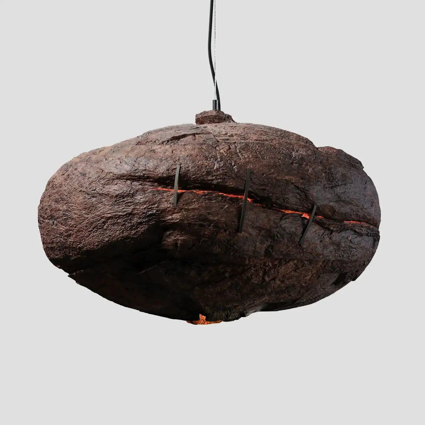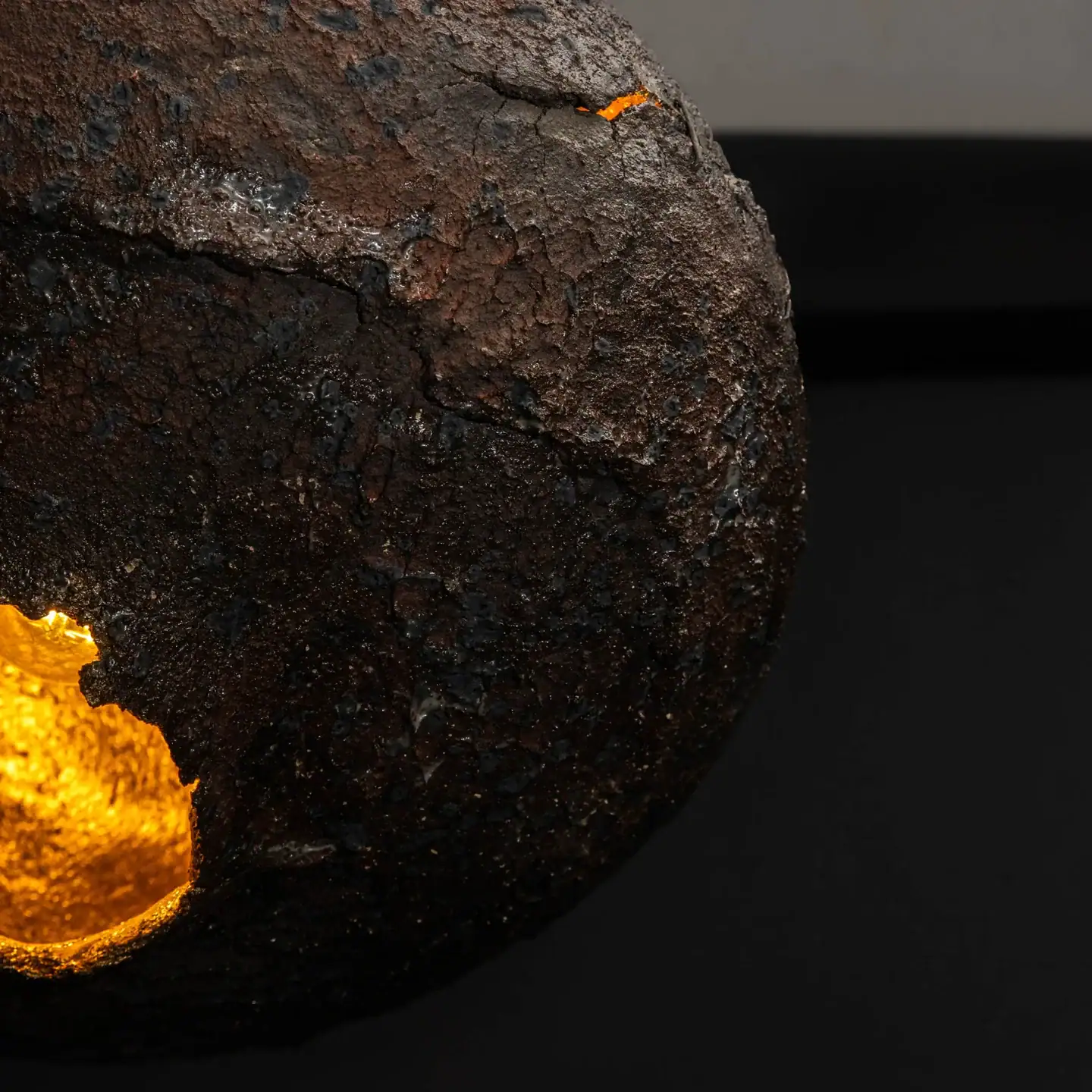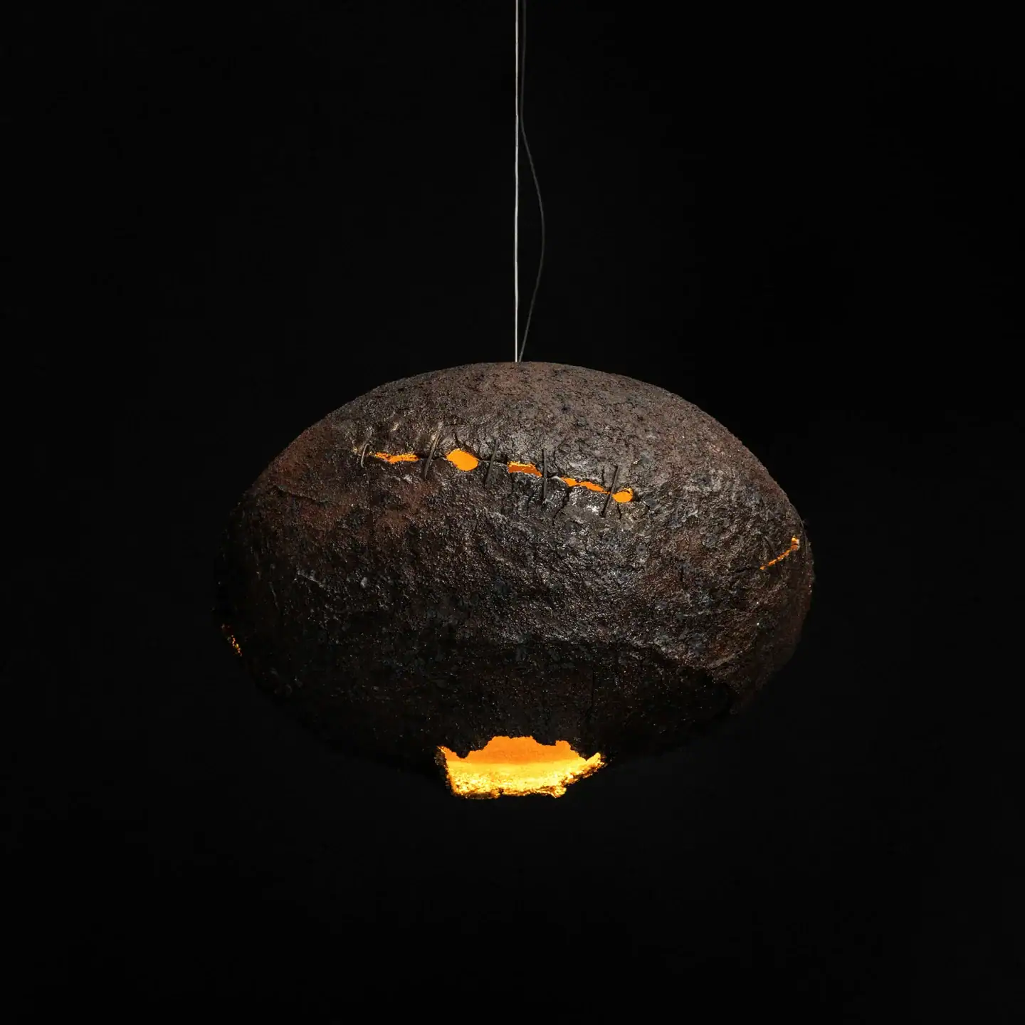 BOOM is the lamp from the series BAVOVNA. The lamp is made of ceramics, has a rough natural texture, and had a crack imitation of the explosion inside, that is maintained by thin strands. The lamp comes in four colors – from natural white, associated with haze, to dark brown – the color of burning.
