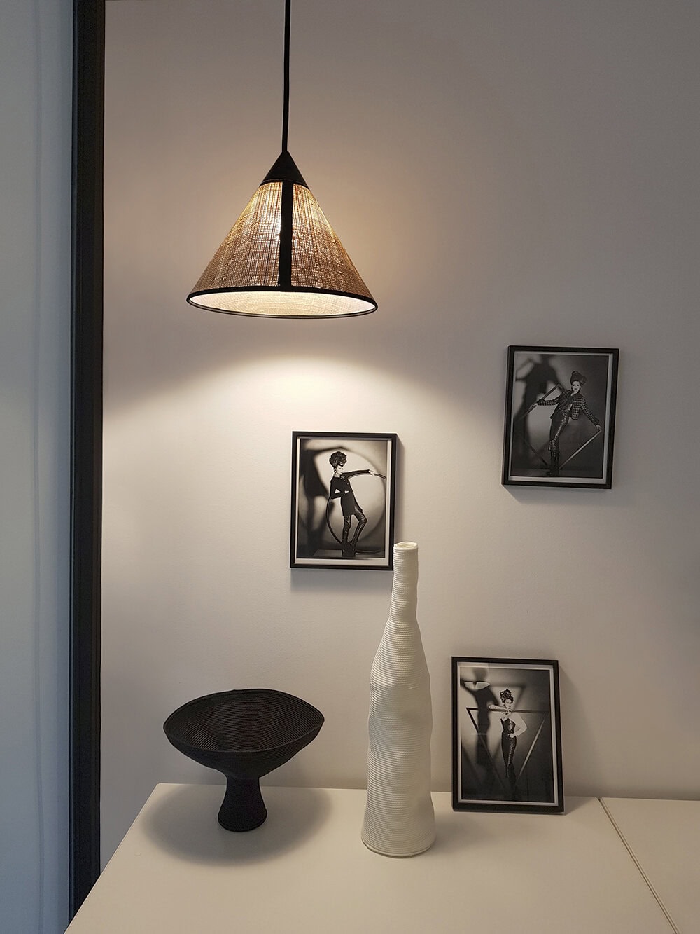 Designheure - Pendant Paris-Hanoï Small - The Vietnamese conical hat is a fashion accessory with a new trend: wearing their conical hat and draped in their ao daï, Vietnamese women exude an irresistible grace.The Paris - Hanoi collection offers a reinterpretation of this accessory of fashion: it dresses spaces naturally by bringing refinement and additional graphics which give it a timelessness beyond summer. A black finishing cone completes the line and coordinates with the black borders. A touch of French elegance associated with the Orient inspired its name: Paris - Hanoi