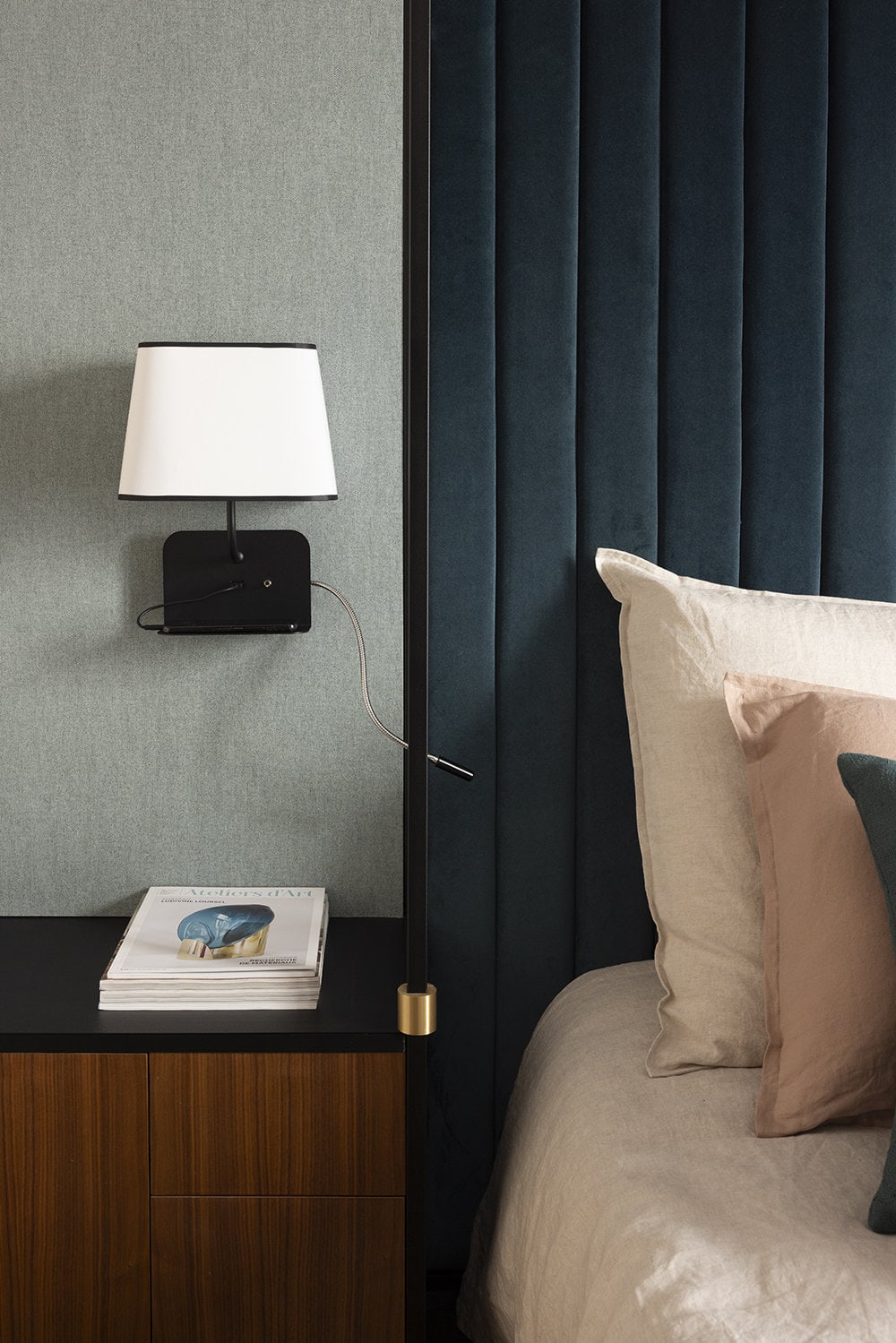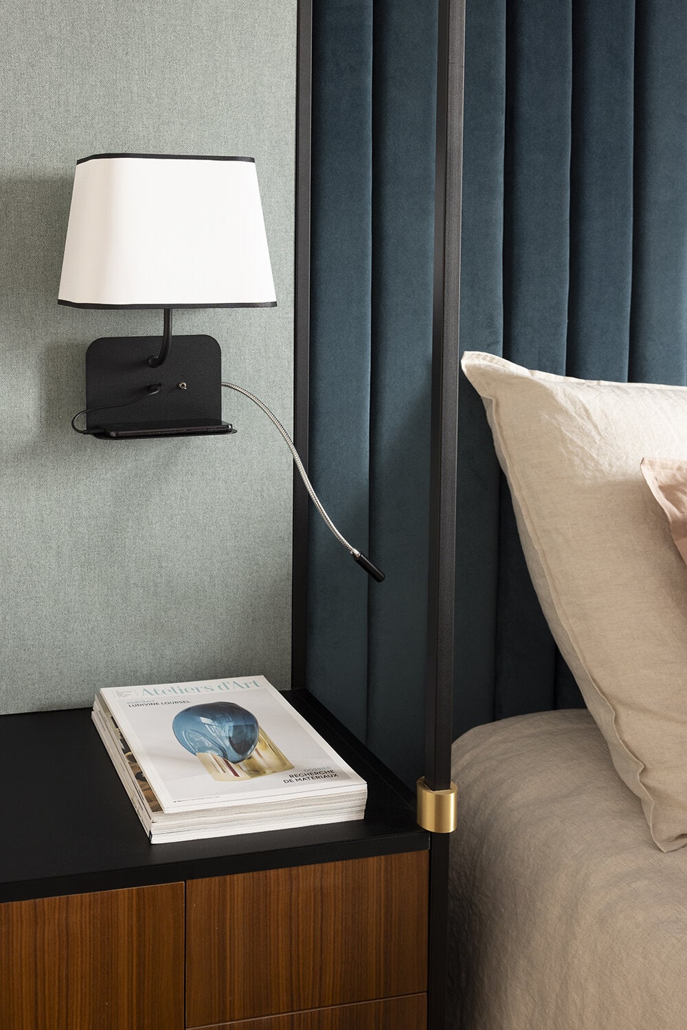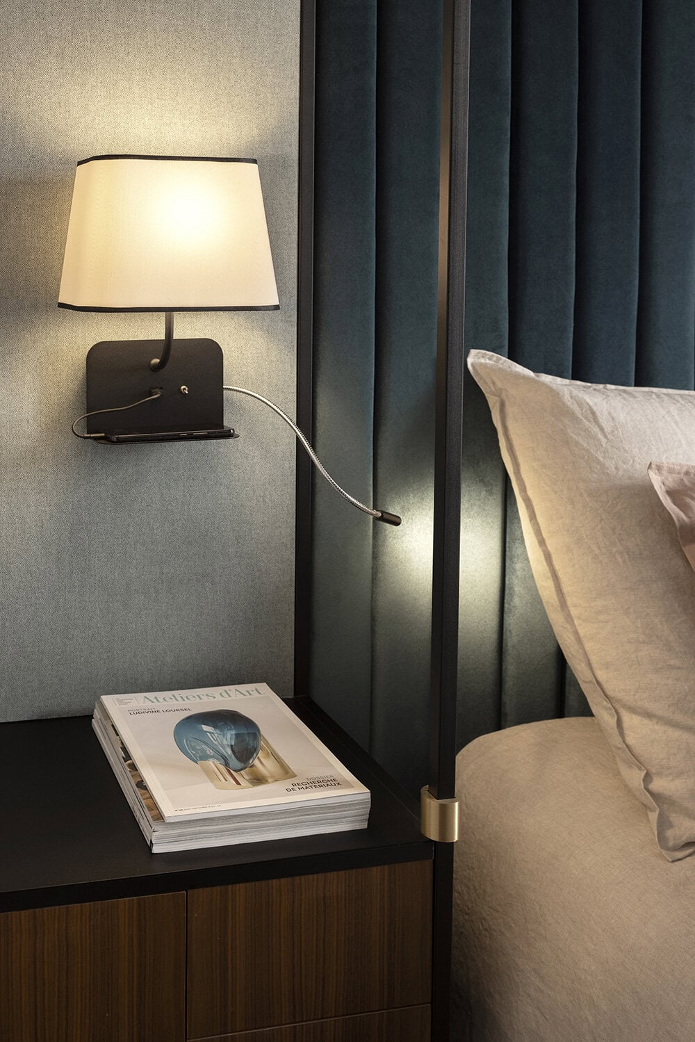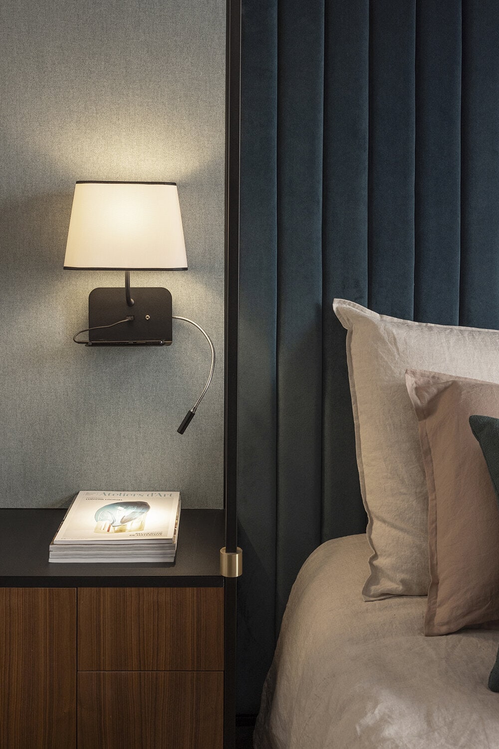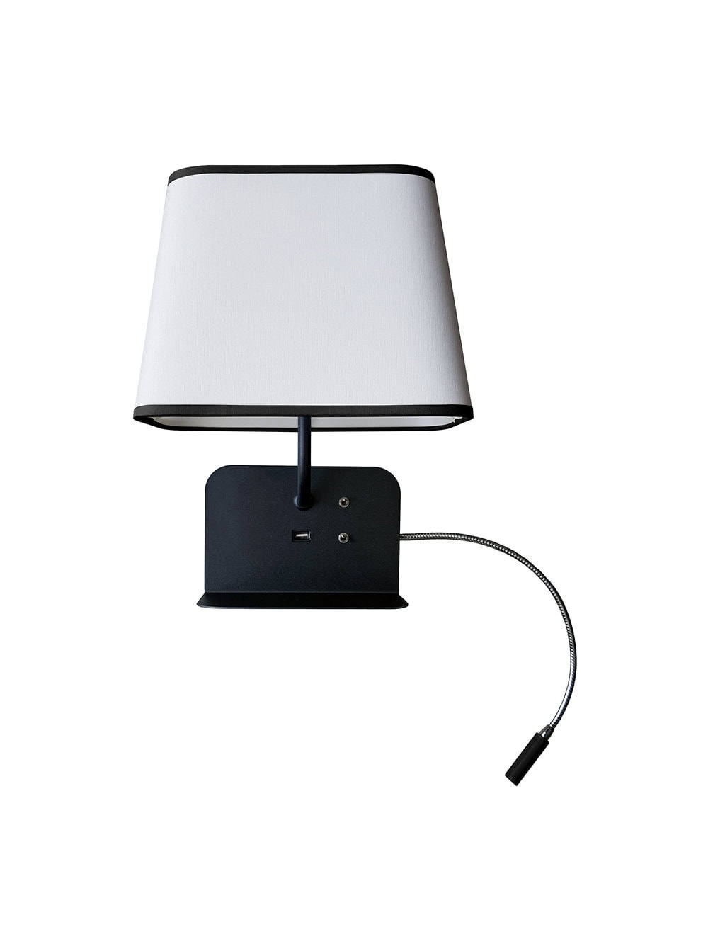 Designheure - Wall Escale fixe USB reader Led Right - The Escale wall lamp echoes the art of receiving and welcoming by offering multifunctional solutions with a design focused on well-being. Its soft curves and the harmony of its proportions make it a cocooning light where comfort meets practicality. A collection particularly adapted to the needs of the hotel industry. Equipped with a slightly inclined shelf to place your smartphone and a USB port, Escale provides a complete response to our connected habits. The wall lamp is available in two versions, one with a lampshade only and a USB port, the other with an LED reading light. The LED reading light version (left or right) has a double switch and is particularly recommended for comfortable reading with or without the light of the main lamp.